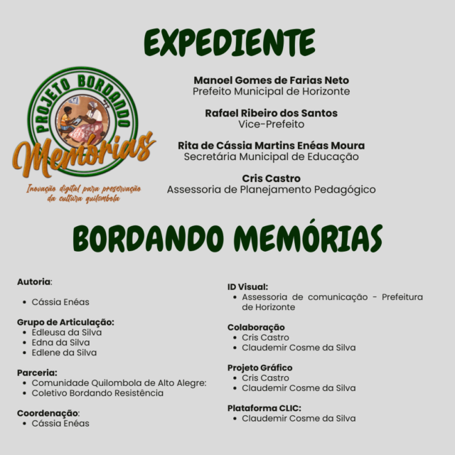 O projeto “Bordando Memórias” é uma extensão do trabalho pioneiro do Coletivo Bordando Resistência, que desde 2017 vem promovendo a inclusão social e cultural das comunidades quilombolas, especialmente as mulheres de Alto Alegre, Horizonte, CE. Inserido no contexto da plataforma CLIC, este projeto representa uma continuação do compromisso em valorizar e preservar a rica identidade cultural quilombola.